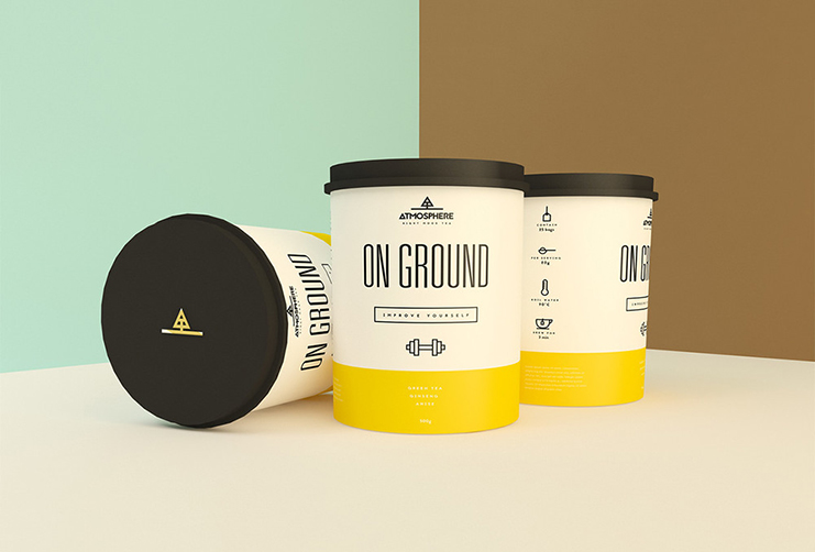 在密閉的圓柱形容器內,保持茶葉內新鮮。每個品種都有一個好名字,意味著它所代表的元素,像“火”和“清新的風”。茶類寫的是一個又高又瘦的無襯線字體,他們都具有代表性的圖標。茶蓋的標志,一個幾何樹站在一個景觀,也看起來像字母“A”的